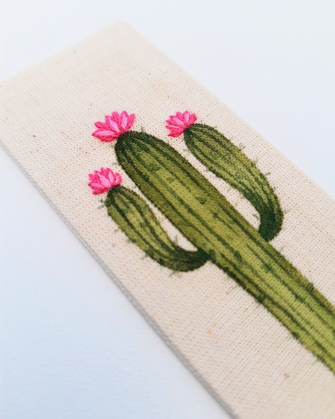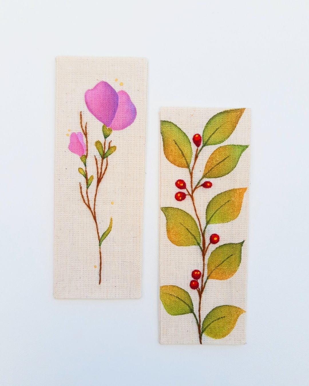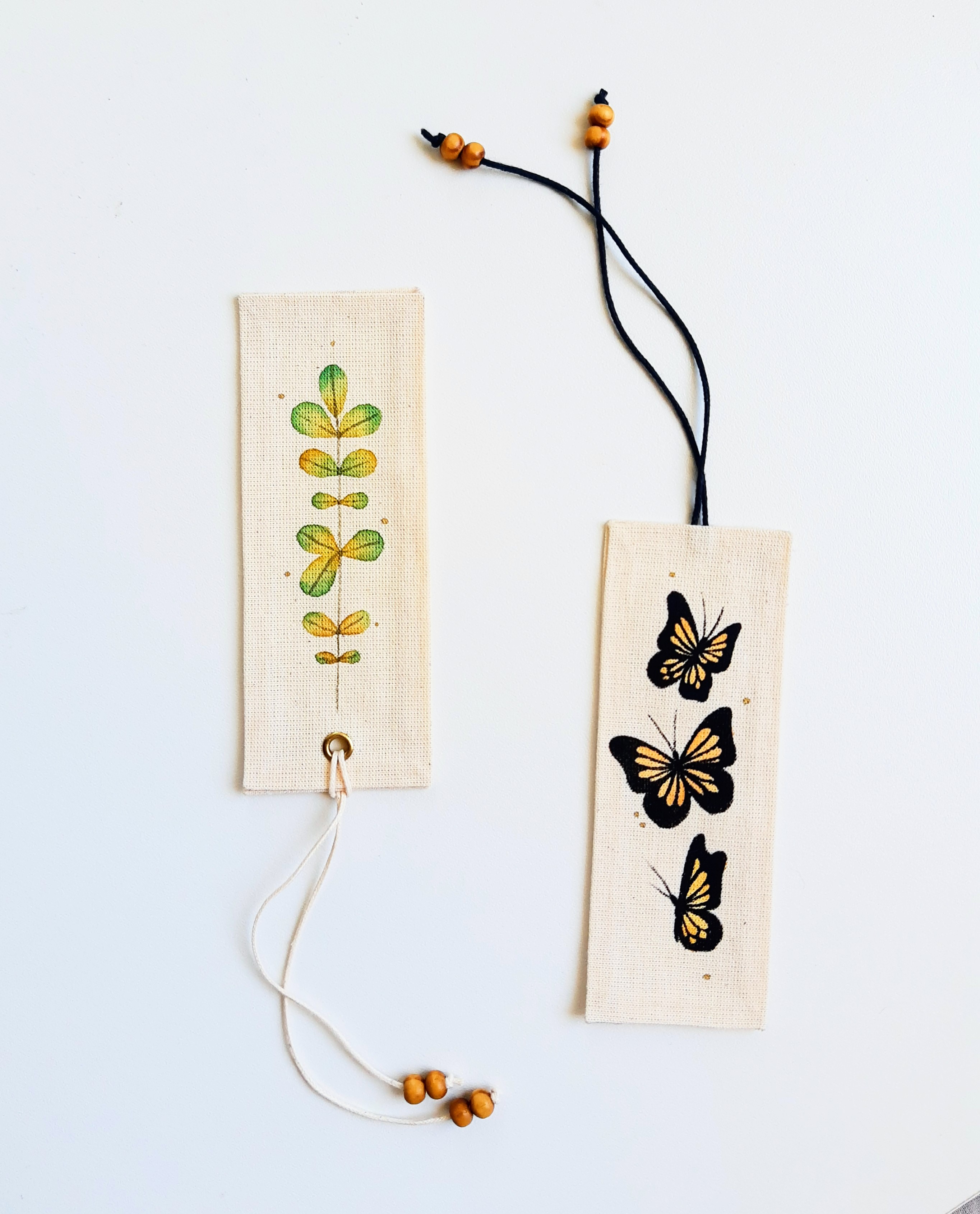 Com a aquarela no algodão, as camadas foram ficando mais suaves. O ponto, repetido com carinho, virou um mantra. Assim nasceram os Marcadores de Páginas: peças simples, úteis e cheias de significado.
